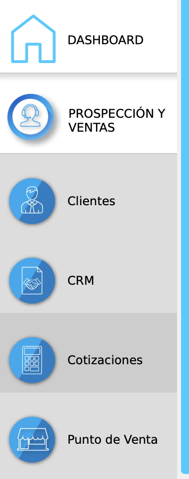 | Para comenzar vaya al menú principal ubicado en la venta lateral izquierda, a continuacion dirijase a la sección de PROSPECCIÓN Y VENTAS y seleccione el módulo de Cotizaciones |