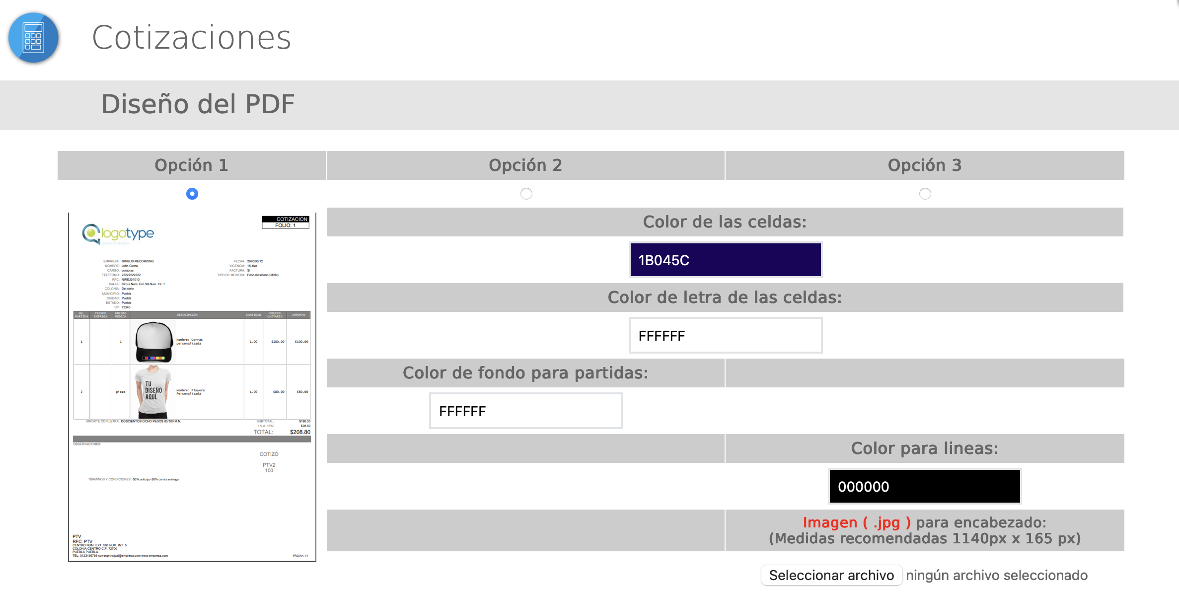 Opción 3: Permite además de cambiar colores, subir un encabezado y pie de página para mantener el diseño de identidad gráfica que su empresa tenga.