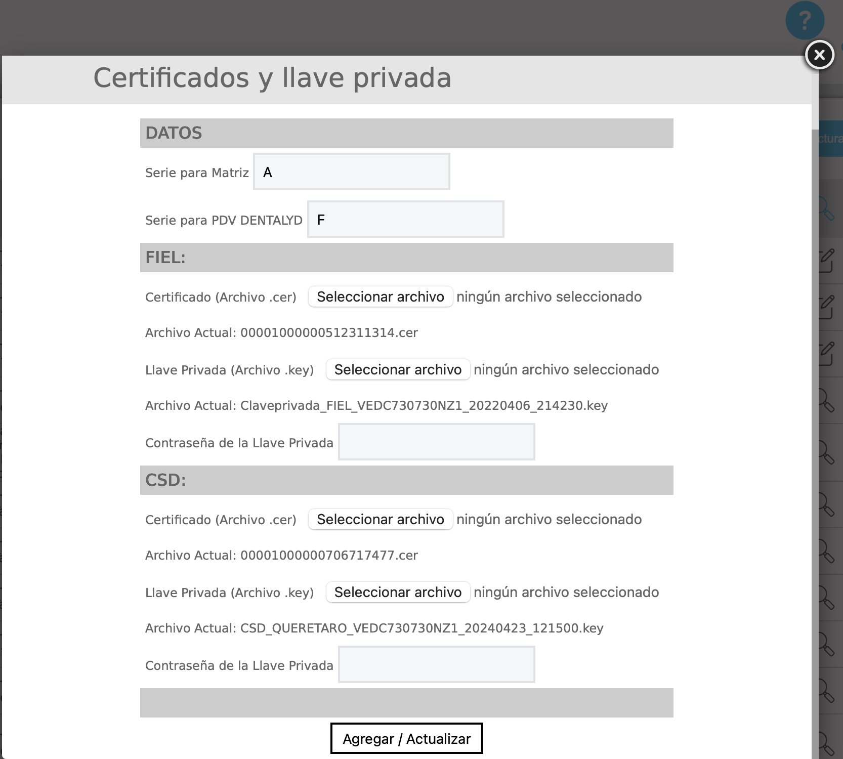 En esta ventana, deberá subir sus archivos. Una vez que usted le da clic en AGREGAR/ACTUALIZAR, el sistema nos mandará una notificación y nuestra área de sistemas verificará que sus datos sean válidos y contraseñas.