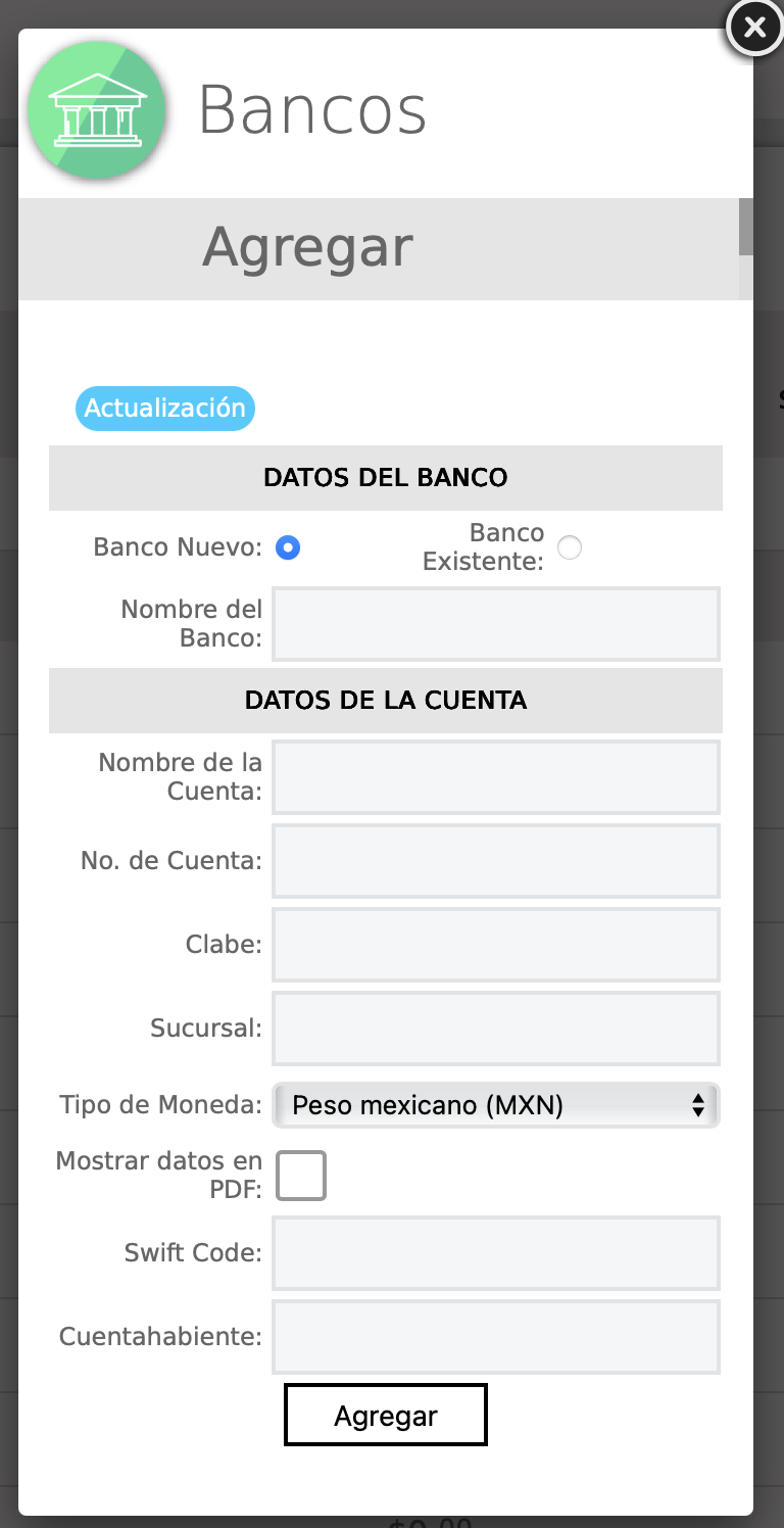 Agregar Banco: Registra el nombre del o los bancos que desees manejar en el sistema.