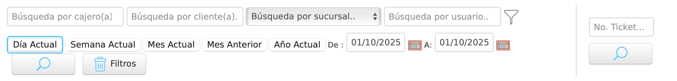Enviar a Correo Electronico: Puedes enviar a un correo deseado.Barra de búsqueda: La barra de búsqueda, te permite hacer búsquedas más avanzadas como por día, semana, mes y año actual, así como por mes anterior o si desea, por rango de fechas, también se puede buscar por cajero, cliente, sucursal o usuario.